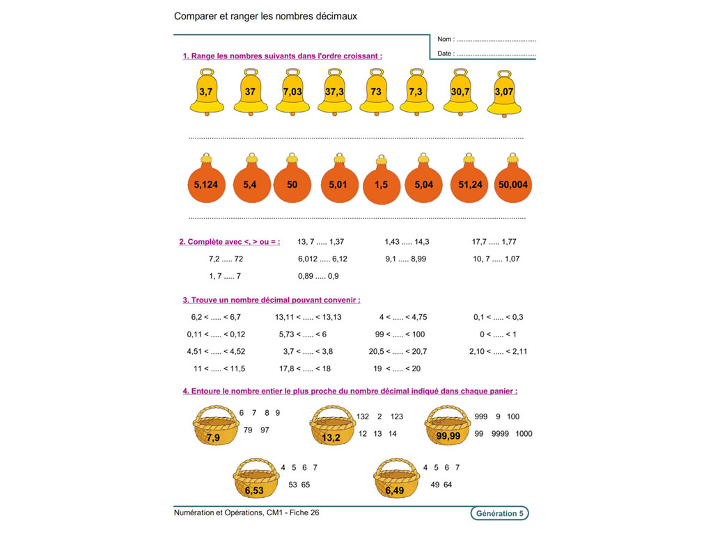 - Les fractions (reconnaissance) / Les fractions (cercles) / Les fractions (carrés) / Les fractions (bandes) / Les fractions inférieures à 1 / Les fractions supérieures à 1 / Les nombres décimaux / Comparer et ranger les nombres décimaux / Les fractions décimales.