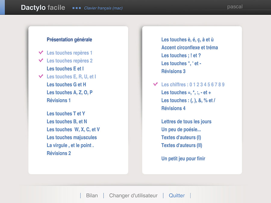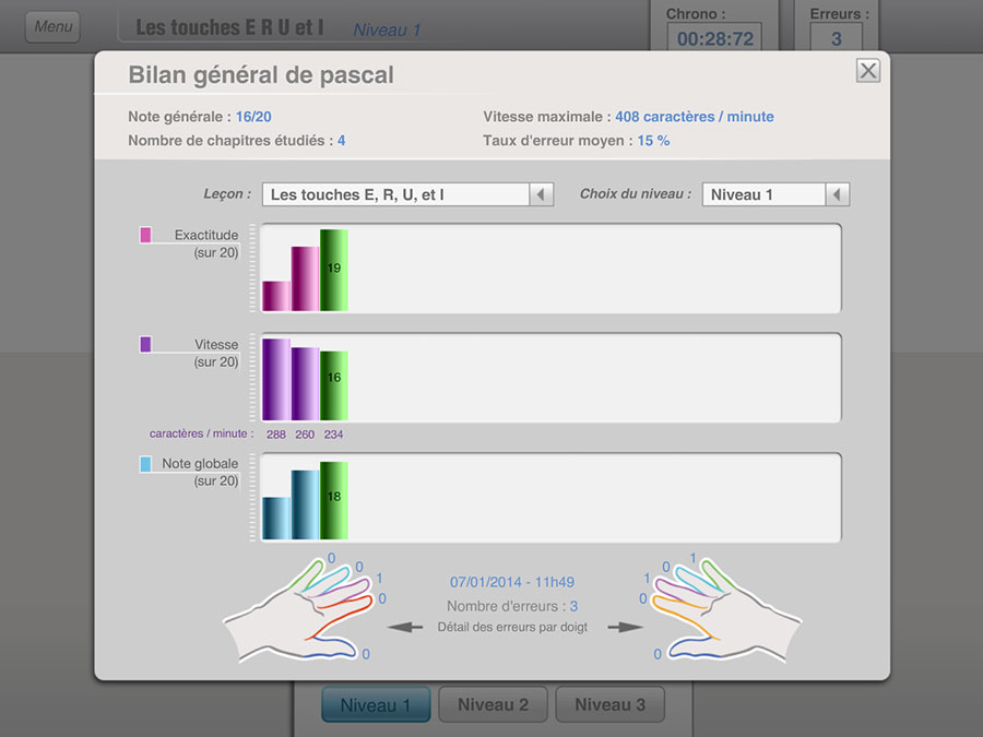 - Bilans détaillés : taux de réussite globale, nombre de mots tapés à la minute, nombre et nature des erreurs pour chacun des doigts, etc.