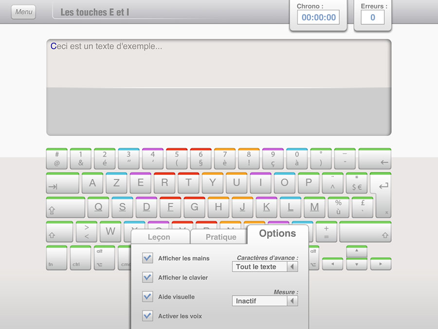 - Nombreux paramétrages : affichage du texte, affichage du clavier, texte audio, métronome, aides visuelles ou sonores, etc. ;