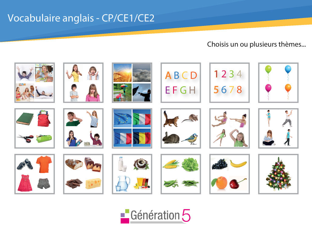 Vocabulaire Anglais CP-CE1-CE2, un logiciel très simple d'emploi pour un enseignement de l'anglais ludique et interactif. Des activités à utiliser sur des postes individuels ou en vidéoprojection au tableau (TBI, vidéoprojecteur).