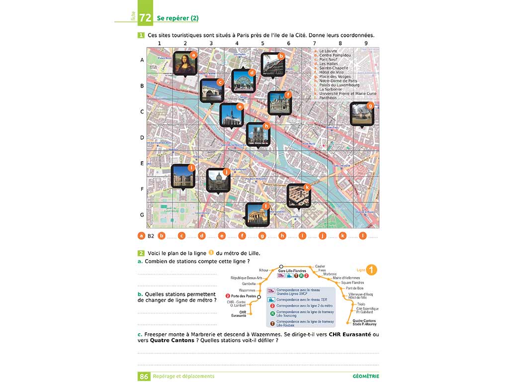 - mises en situation variées : énoncés illustrés, photos, cartes, tableaux, schémas, diagrammes, coloriages codés, énigmes, etc.