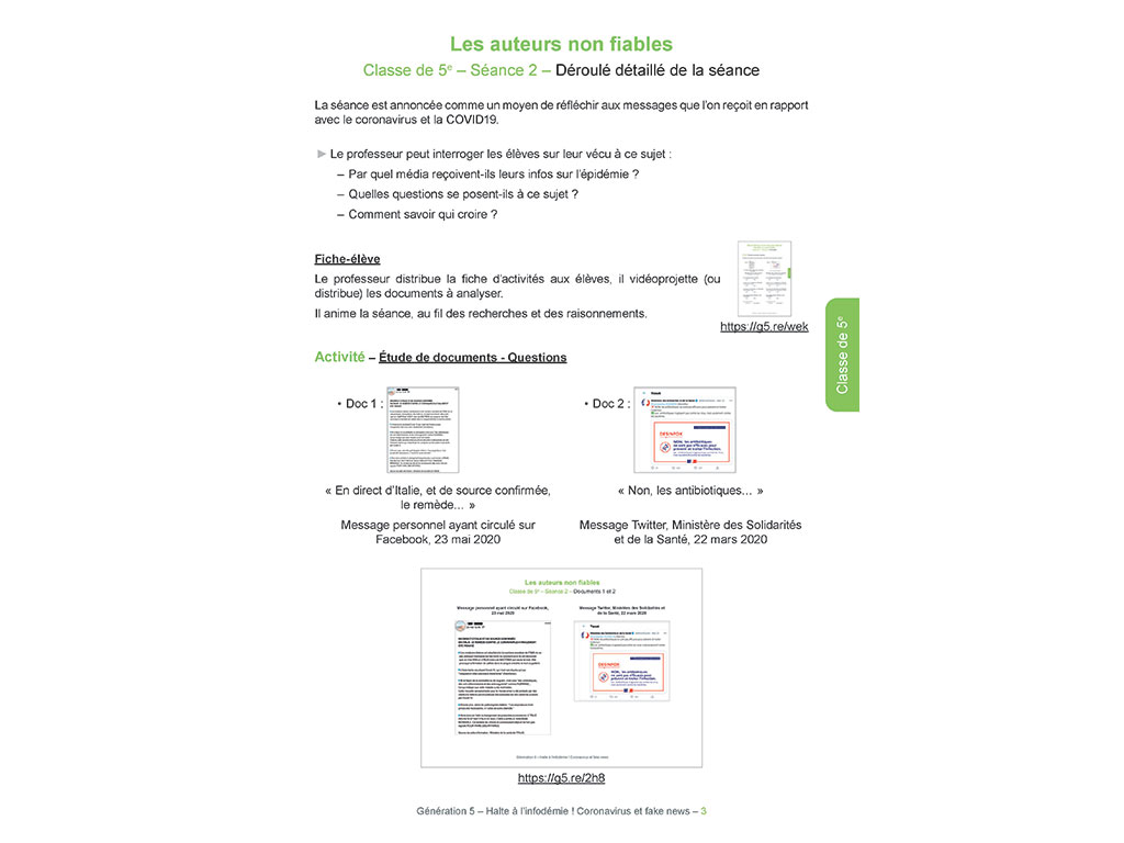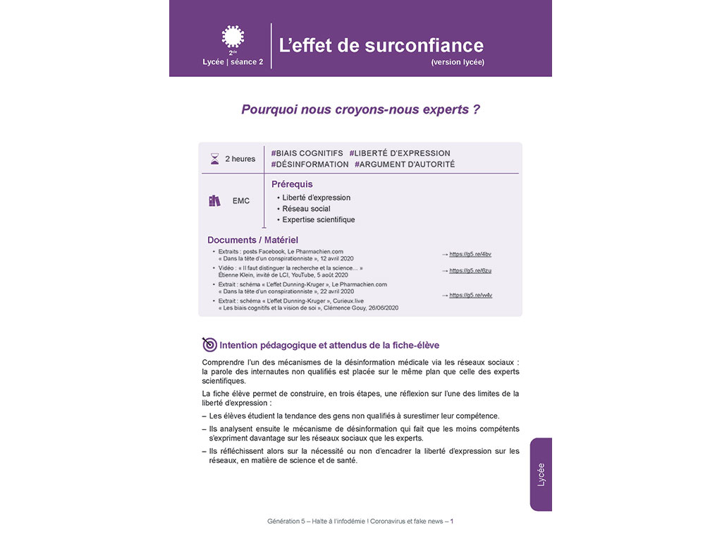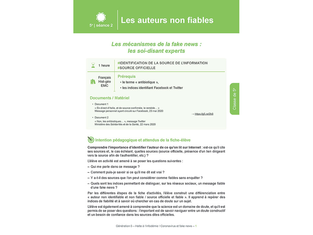Il aborde, par l'exemple précis de l'épidémie du Covid-19, les gestes barrières face à la désinformation virale au collège et au lycée, de la 6e à la Terminale.