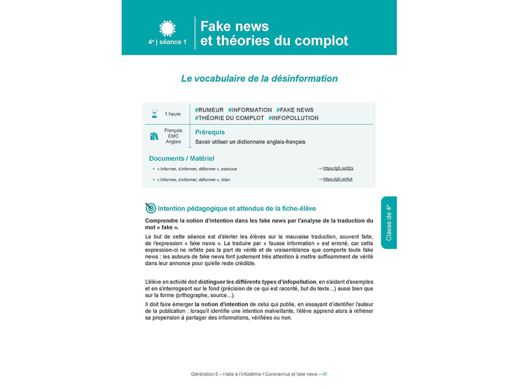 Le dossier pédagogique Halte à l'infodémie ! Coronavirus et Fake news est composé de 24 séances clés en main, chacune organisée avec :