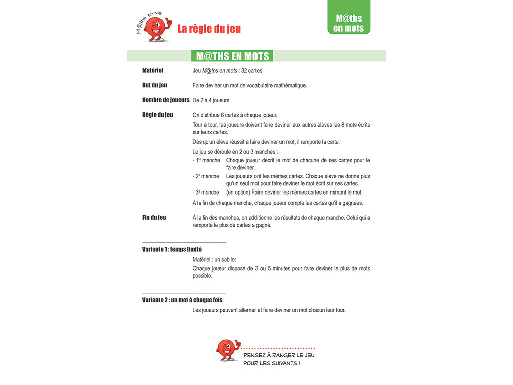 Extrait n°3 : Fiche élève - règles du jeu "M@ths en mots" et aides tutorielles