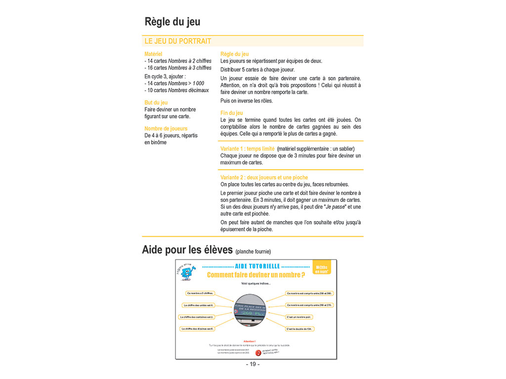 - un livret A5 pour l’enseignant : compétences travaillées, intérêts pédagogiques, synthèse des règles, variantes possibles, visualisation des aides et de l'ensemble des cartes à jouer ;