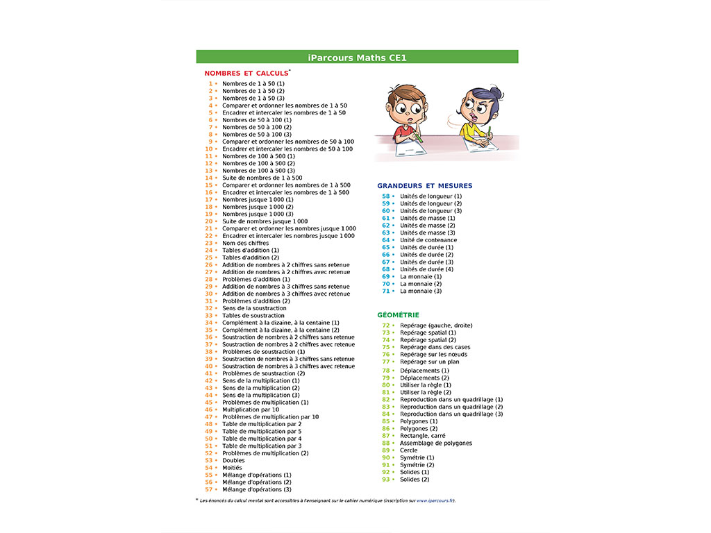 L'enseignant peut s'équiper en parallèle du Guide de l'enseignant iParcours CE1 : références au programme scolaire, attendus de fin d'année, propositions de progression annuelle, énoncés de calcul mental, fiches d'évaluation et la totalité des corrigés.