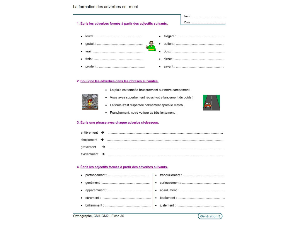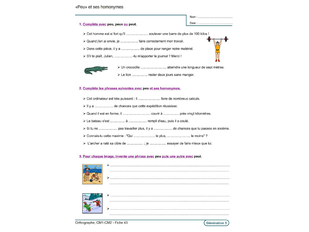 - Les adjectifs de couleurs, les adjectifs numéraux / Les homonymes (ce/se, ou/où, la/là, l’a(s), ses/ces, c’est/s’est, peu/peux/peut, quel/ qu’elle) / Les homonymes courants (court, vers, sans, quand, mais..)
