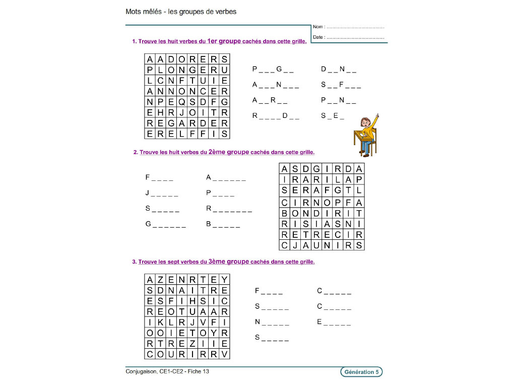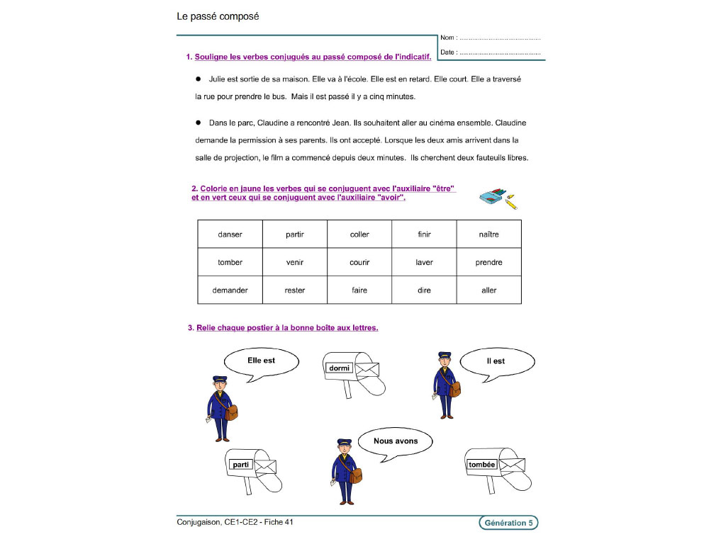 Reconnaître le verbe et le sujet / Connaître l’infinitif et les groupes des verbes / Distinguer le passé, le présent, le futur / Savoir identifier et conjuguer les verbes courants (des 3 groupes) à l’indicatif présent, futur simple, imparfait, passé composé / Maîtriser la conjugaison des verbes être, avoir, aller, faire, dire, venir.